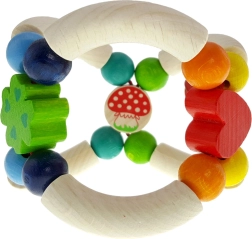 Lesena ropotuljica mušnica je izdelana iz kakovostnega lesa in kovinskega zvončka. Sodobna barvna izvedba in gladka obdelava sta prijazni do otroških rok, lahka zasnova pa olajša prijem. Igrača je primerna za dojenčke od rojstva in podpira čutno zaznavanje ter prve namerne gibe.