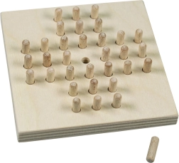 Leseni solitaire Detoa prinaša pametno zabavo v kompaktni izvedbi. Igra se začne z odstranitvijo sredinskega zatiča in nadaljuje s preskakovanjem sosednjih zatičev vodoravno ali navpično. Vsak preskočen zatič se s plošče odstrani – načrtujte poteze vnaprej in poskusite na koncu pustiti le enega.