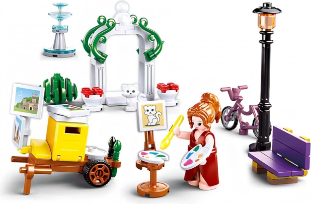 Predstavljamo Sluban Dekliške sanje Vas - Slikarka v parku, gradnik, ki prinaša ure zabave in ustvarjalne igre. Vsebuje 114 kosov in eno figurico z edinstveno gibljivimi deli, kar omogoča lahkotno vstopanje v vlogo slikarke na svežem zraku.