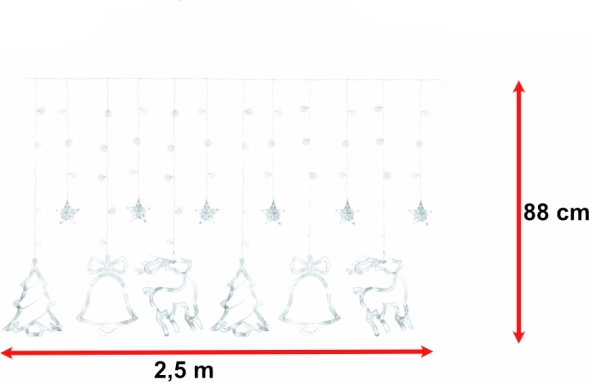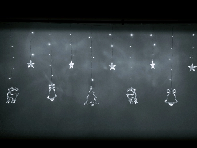 Ustvarite doma čarobno praznično vzdušje z zaveso z motivi severnega jelena, drevesca, zvezde in zvončka. 138 LED v odtenku hladno bela nežno osvetli notranjost, ponuja 8 svetlobnih načinov in zahvaljujoč omrežnemu napajanju sveti brez skrbi z baterijami. Robustni kabel zagotavlja dolgo življenjsko dobo, praktični povezovalni konektorji pa omogočajo združevanje več kompletov skupaj.