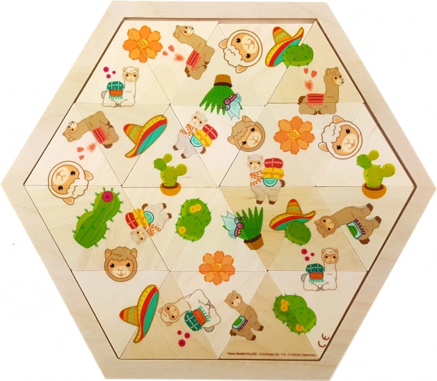 Zabaven lesen mozaik z motivom lame za otroke od 3 let. Vsebuje 24 barvno potiskanih kosov v praktičnem lesenem okvirju. Spodbuja fino motoriko, koncentracijo ter veščine opazovanja, primerjanja in povezovanja motivov.