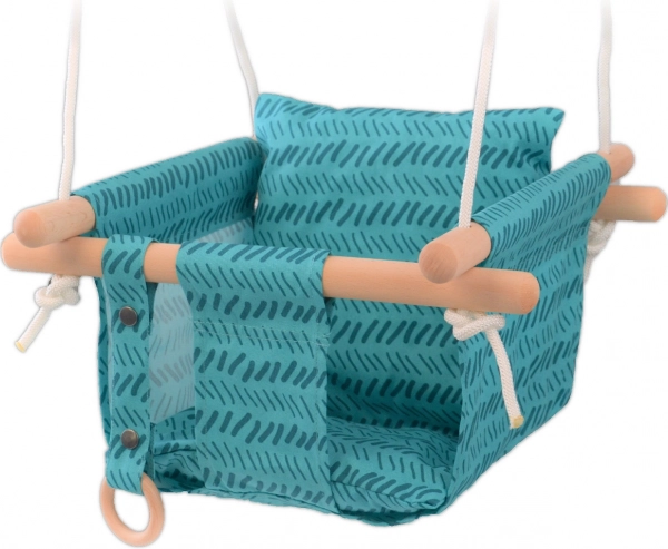 Montaža je hitra in praktična: v paketu prejmete 2 karabina in višinsko nastavljiva vrvi do 180 cm, zato gugalnico zlahka prilagodite prostoru in višini obešanja. Turkizna zasnova doda igriv poudarek vsakemu otroškemu kotičku, igrišču ali vrtu.