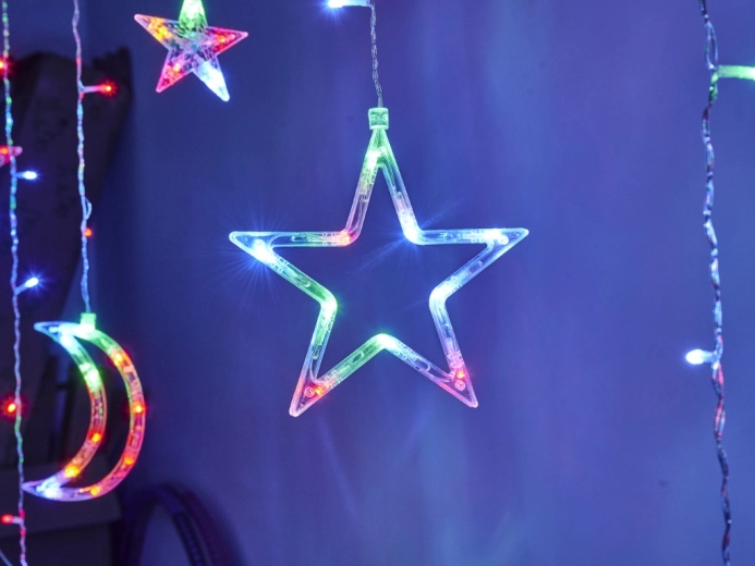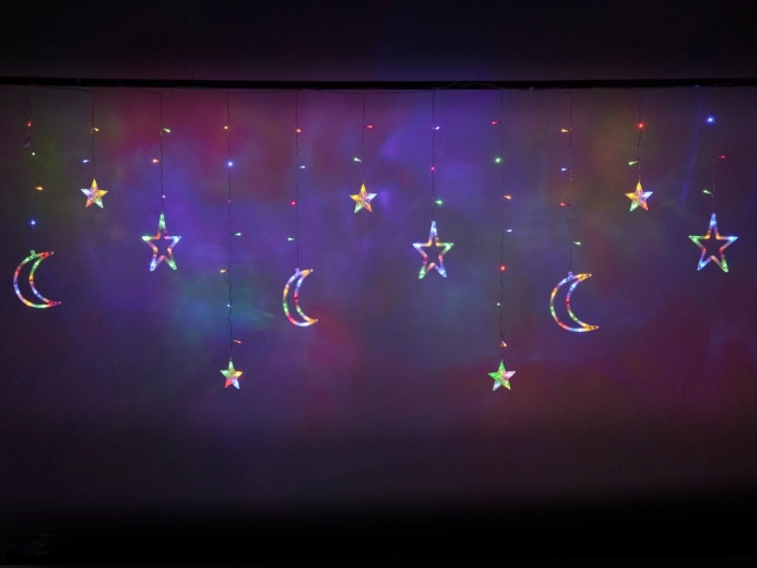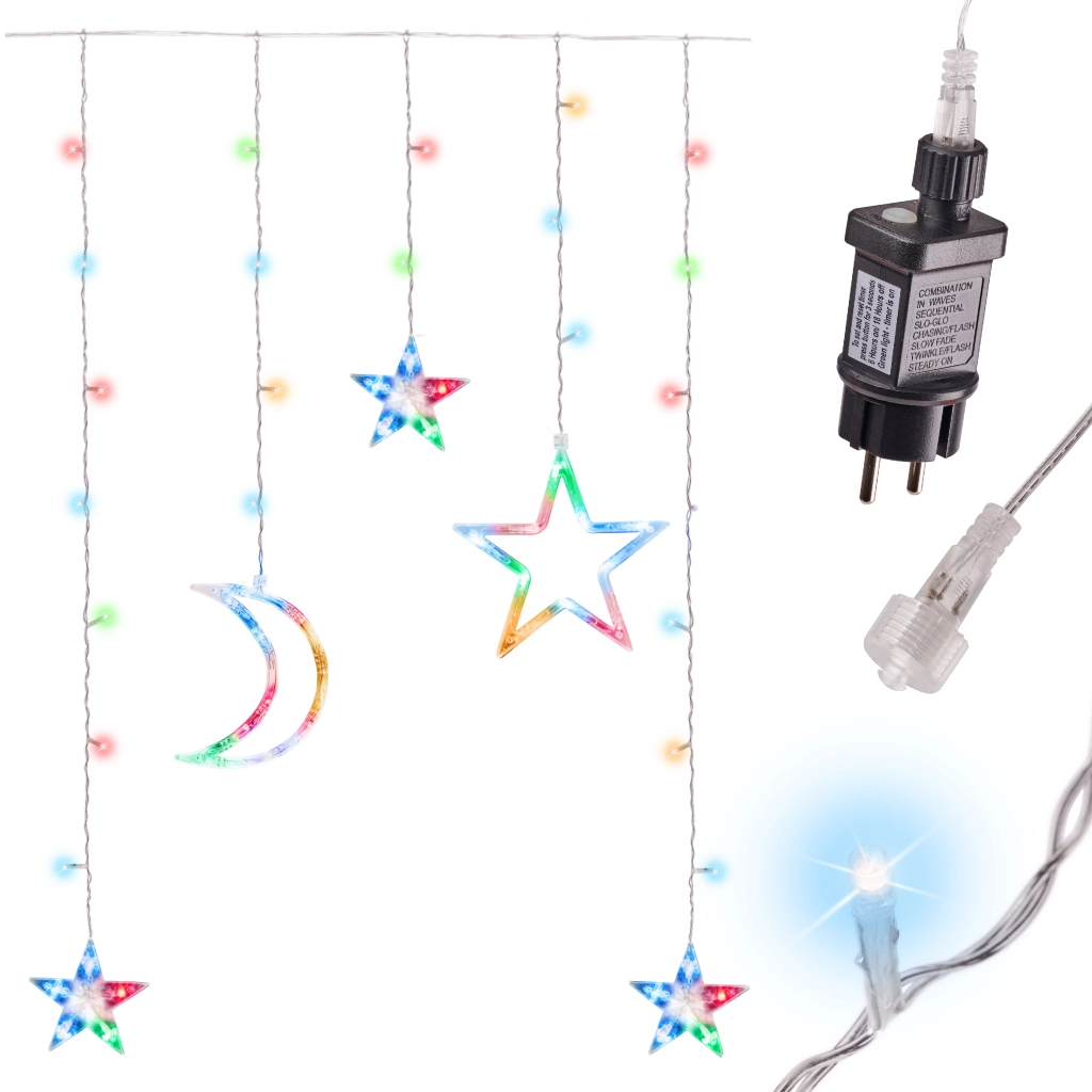 Ta dekorativna LED zavesa z lunami in zvezdami v hipu spremeni okno, steno ali otroško sobo v pravljičen kotiček. Večbarvna svetloba prostoru doda praznično razpoloženje in prijetno osvetlitev skozi vse leto.