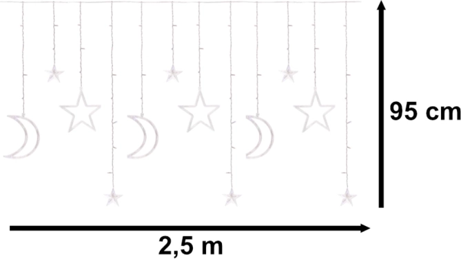 V svoj dom vnesite čar božiča s svetlobno LED zaveso z motivom lune in zvezd. Barvne diode in do 8 svetlobnih načinov ustvarijo prijetno, domačno vzdušje za zimske večere, družinske fotografije in zabave. Zahvaljujoč dolžini 2,5 m, 138 LED in napajanju iz omrežja sveti stabilno in varčno.