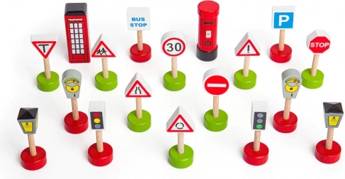Set lesenih prometnih znakov BIGJIGS RAIL je idealen dodatek k vlakovnim potem in drugim lesenim gradbenim kompletom. Jasno ilustrirani simboli (STOP, hitrost, opozorilo ipd.) otroke na zabaven način seznanijo z osnovami prometne vzgoje. Robusten naravni les zagotavlja dolgo življenjsko dobo tudi pri vsakodnevni uporabi.