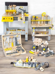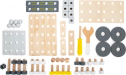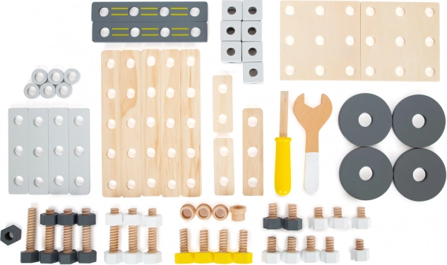 V paketu je bogata oprema: konstrukcijske letve in plošče s predvrtanimi luknjami, kocke, kolesa, adapterji za kolesa, distančna pušica ter dve leseni orodji – ključ in izvijač. Vse pregledno shranite v praktični box, zato se noben delček ne izgubi.