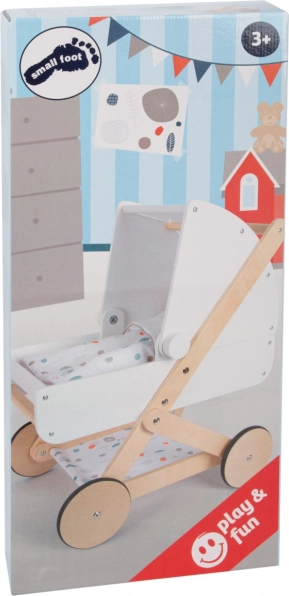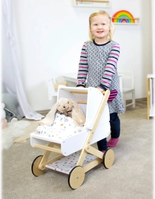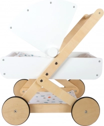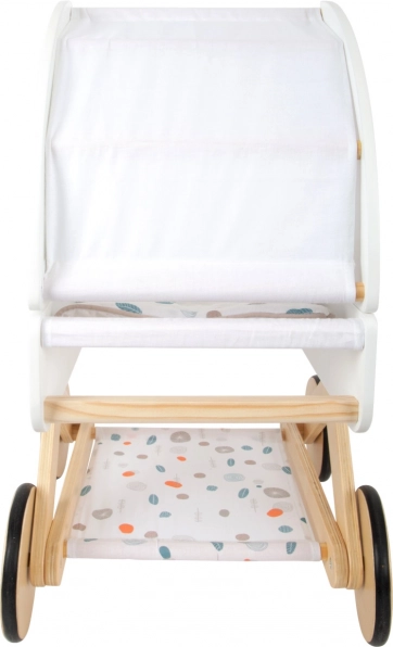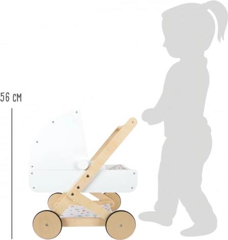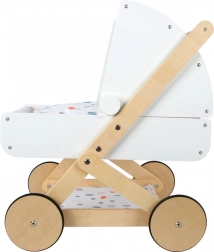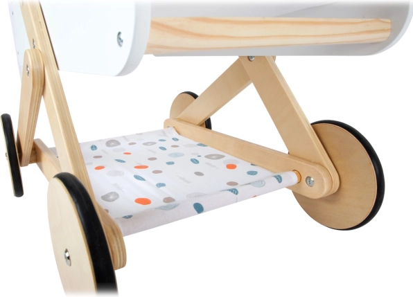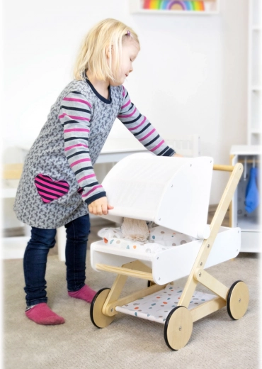 Odkrijte kakovosten voziček za punčke, ki se odlično poda v vsako otroško sobo. Združuje naravni les, trpežne in pralno-obrisljive tkanine ter nežno barvno paleto. Nizka teža in stabilna konstrukcija zagotavljata varno vožnjo, medtem ko gumirana kolesa poskrbijo za tih tek na katerikoli podlagi.