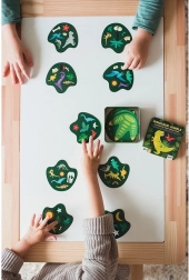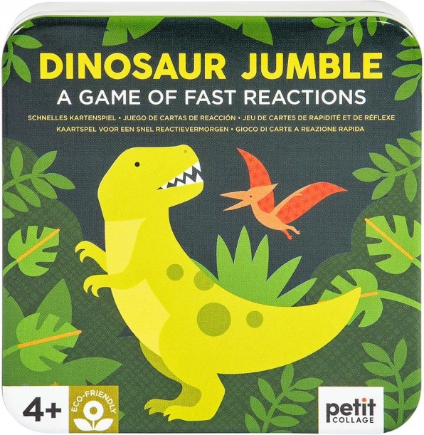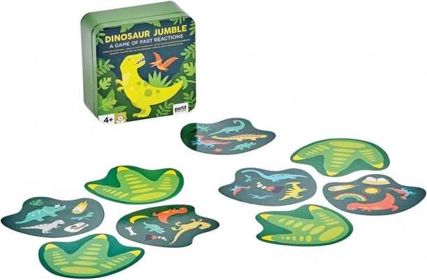 Vadite svojo pozornost z dinozavri. Ta karte igra ponuja do pet različic pravil in je polna barvitih ilustracij na temo dinozavrov. Hitro vam bo prirasla k srcu tudi zaradi priročne velikosti, zato je primerna za igro doma in na poti. Pakirano v kovinski škatlici brez uporabe plastike. Glavne značilnosti za 2–6 igralcev 5 različic pravil praktična embalaža Navodila za igro: Osnovna različica: Vsakemu igralcu razdelite eno karto z licem navzdol. Paket kart obrnjen z licem navzgor položite med igralce. Na dogovorjen znak igralci obrnejo svoje karte. Igralec, ki prvi poimenuje enak simbol na svoji karti in na karti v paketu, vzame karto iz paketa. Tako se paket na koncu pobere in zmagovalec je igralec z največ kartami. Obrnjena različica: Razdelite karte med igralce tako, da imajo vsi enako število kart, ena karta pa ostane. Igralci položijo svoje karte v kupčku pred sebe z licem navzdol. Preostalo karto, obrnjeno z licem navzgor, položite med igralce. Na dogovorjen znak igralci obrnejo vrhnjo karto svojega kupčka. Kdor prvi poimenuje simbol, ki je enak na njegovi karti in na karti med igralci, svojo karto položi med igralce na nastajajoči kupček in obrne naslednjo svojo vrhnjo karto. Tako igra poteka, dokler ne ostane zadnji igralec s kartami, ta postane poraženec. Igralec, ki se kart prvi znebi, je zmagovalec. Skupinska različica: Igra se po krogih. V vsakem krogu vsak posameznik prejme po eno karto z licem navzdol. Na dogovorjen znak igralci obrnejo svojo karto, tisti, ki poimenuje in napove simbol, enak simbolu na karti drugega igralca, mu svojo karto preda. Tako igra poteka, dokler en igralec ne prejme vseh v posameznem krogu razdeljenih kart. Cilj igre je znebiti se kart; igralec, ki je v seštevku krogov prejel največ kart, je poraženec. Dimenzije embalaže: 10 × 10,5 × 5 cm Starost: 4+ Material: kovina, papir Število delov: 31 kosov
