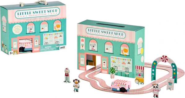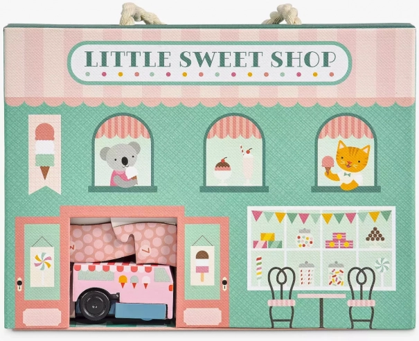 Privoščite otrokom sladko pustolovščino z igralnim setom slaščičarna znamke PETIT COLLAGE. Obojestranska slaščičarna, leseni navijalni sladoledarski avto in preprosto sestavljiva proga iz 8 delov zagotavljajo ure kreativne zabave. Set je brez plastične embalaže, izdelan iz materialov s FSC certifikatom in se zaradi vrvnega ročaja enostavno prenaša – idealno za dom in za na pot.