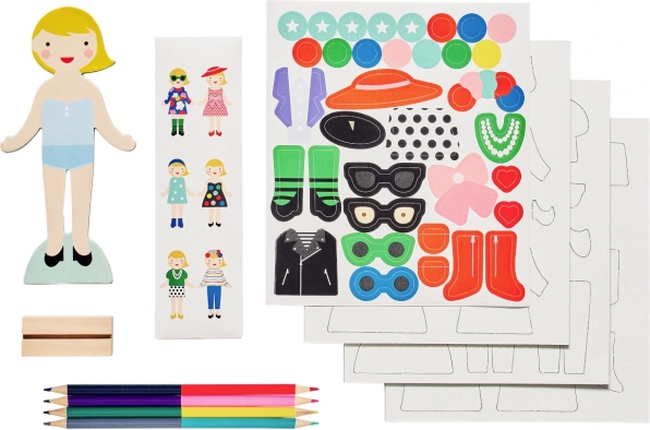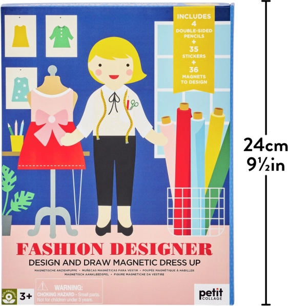 Igrača vsebuje magnetno figurico z lesenim stojalom, 36 magnetnih kosov oblačil, 4 obojestranske voščenke in 35 nalepk, kar omogoča ustvarjanje več kot 100 različnih stilov. Otroci lahko izražajo svojo kreativnost in razvijajo domišljijo z raznolikostjo kosov in možnostmi kombinacij. Škatla služi ne le kot shranjevalni prostor, temveč tudi kot prijetno ozadje za igro, s čimer postane celotna izkušnja celovita in estetska.