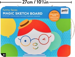 Ta risalna tabla ima kompaktne mere 27×19×1 cm in vsebuje enostavno pisalo, pritrjeno na tablo z vrvico. Zahvaljujoč brisalcu in šablonam lahko otroci svoje ideje zlahka spremenijo v nove stvaritve!