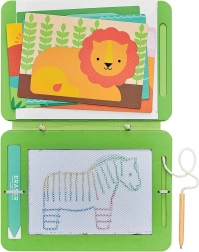 Vključuje pisalo na vrvici in brisljivo površino za hitro ter preprosto brisanje risb.