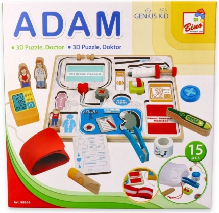 Ta barvita vstavljanka znamke Bino otrokom na igriv način predstavlja svet zdravstva. Zaradi jasno oblikovanih koščkov otroci zlahka prepoznajo in uvrstijo stetoskop, termometer, injekcijo in druge pripomočke na pravo mesto na plošči. Med igro vadijo prijem, zbranost in potrpežljivost.