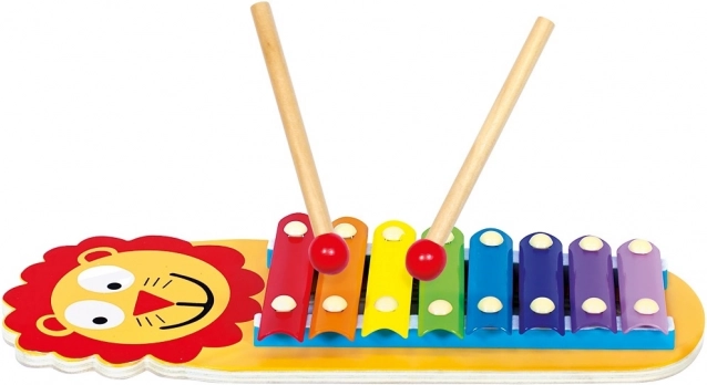 Otroški ksilofon z veselim motivom levčka prinaša zabavno učenje in kreativno igranje. Osem barvitih kovinskih ploščic na lesenem okvirju zveni jasno in prijetno, zato otroci zlahka odkrivajo tone, ritem in prve melodije. Del paketa sta dve leseni paličici za udobno igranje z obema rokama.
