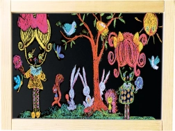V paketu je vse potrebno: kreda, flomaster, gobica in več magnetnih sličic. Tablo je mogoče hitro zložiti in prostorsko varčno shraniti, zato ne zavzame veliko prostora. Dve delovni površini omogočata, da dva otroka ustvarjata hkrati.
