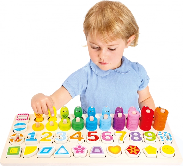 S pomočjo barvnih oblik in številk igrača spodbuja učenje osnov štetja in prepoznavanje oblik.