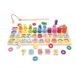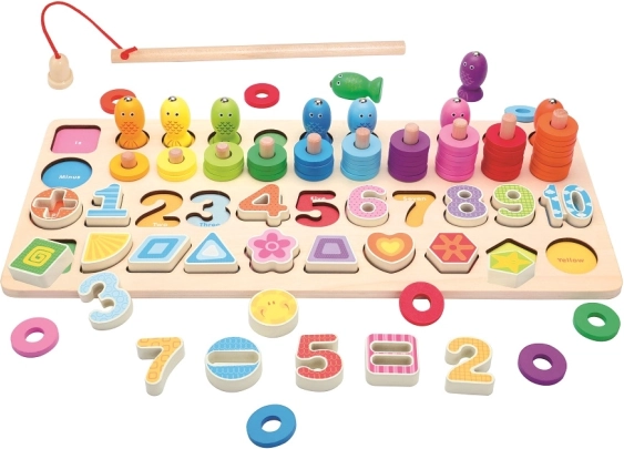 Igra vključuje različne elemente, ki jih otroci lahko uporabljajo za ribolov, zlaganje številk ali zlaganje obročev. Vsi deli so zasnovani tako, da jih lahko male otroške roke enostavno primejo, kar spodbuja njihovo samostojnost in ustvarjalno raziskovanje.