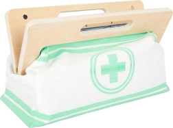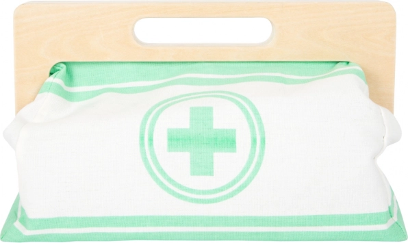 Ta skrbno izdelan zdravniški set združuje naravni les in kakovosten tekstil v varno in zabavno igračo za otroke od 3 let dalje. Praktična torba z magnetnim zapiranjem ohranja vse pripomočke skupaj, izrazit zeleni križ pa poskrbi, da jo vedno zlahka najdete.