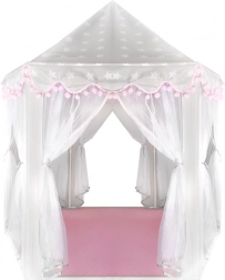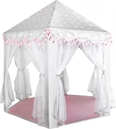 Prostorna podloga in zračne stranice zagotavljajo udobje za enega ali več otrok – vanj gre veliko blazin, plišastih igrač in knjig. Šotor je odlična izbira za notranje prostore in vrt pod nadzorom odraslih. Dekorativni cofki in možnost zavezovanja zavesic v pentlje dodajo igri šarm in zasebnost.