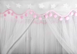 Sivo‑rožnata kombinacija z zvezdami in dekorativnimi cofi očara otroke in starše. Odlično izgleda tudi z dodatno osvetlitvijo.