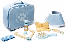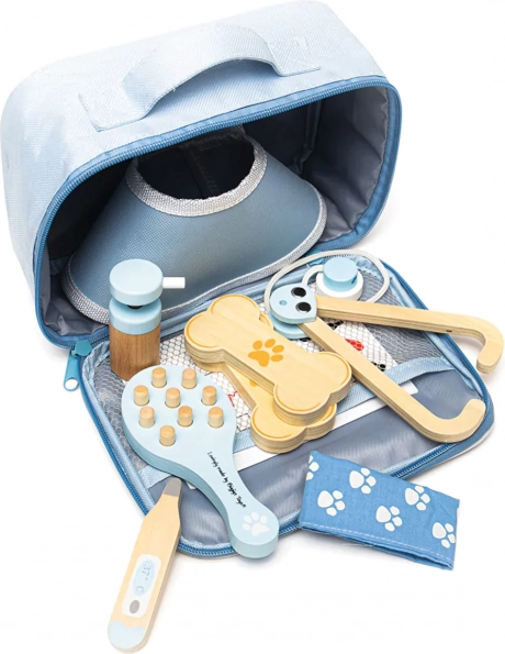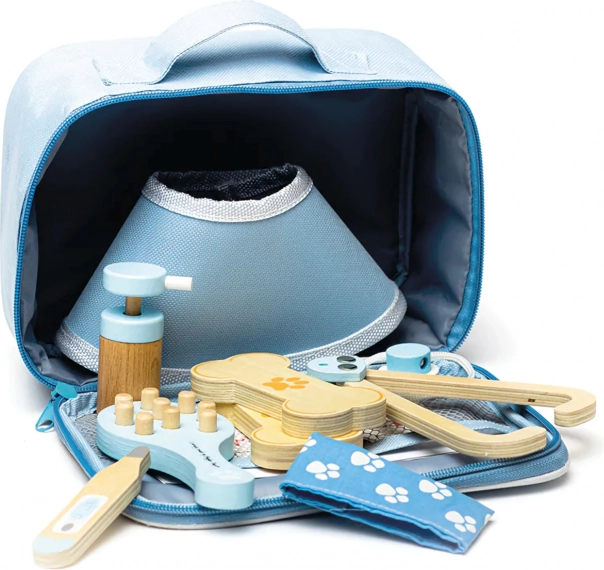 Popoln veterinarski kovček otrokom omogoča skrb za plišaste igrače in figurice ljubljenčkov kot pravi zdravnik. V kompletu ne manjkajo orodja, kot so stetoskop, termometer, otoskop, injekcijska brizga, povoj, krtača, zaščitni ovratnik in drugi dodatki. Vse je shranjeno v trpežni tekstilni torbici s tačko, idealni za prenašanje in shranjevanje.