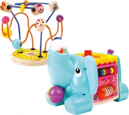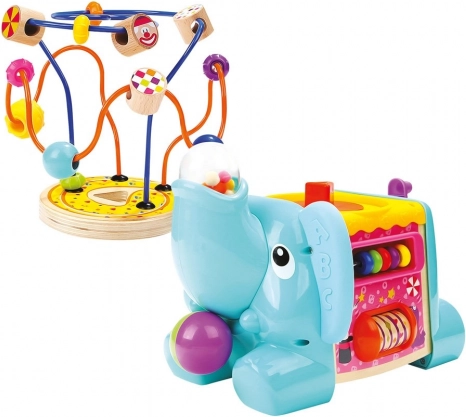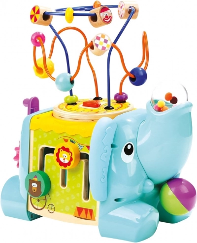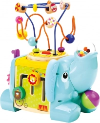 Ta večfunkcijska motorična kocka v obliki slona je idealna izobraževalna igrača za najmlajše. Zaradi barvitih elementov in raznolikih aktivnosti otroci naravno urijo fino motoriko, prostorsko zaznavo in senzorične veščine. Zgornji del sestavlja motorični labirint s kroglicami, stranice krasijo zobata kolesca, drsni deli in druge domiselne naloge.