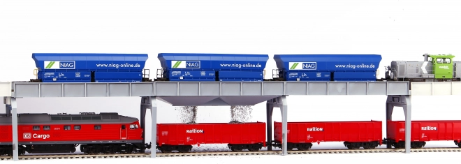 Realističen model betonskega okvirnega mostu z integrirano funkcijo izpraznjevanja razsutih tovorov za merilo H0. Sestavljen je iz treh segmentov z ležiščem za tire in kulisami za samodejno odpiranje loput vagonov. Idealni dodatek za podrobna tirovna postajališča in nemoteno obratovanje tovornih kompozicij. Funkcionalno izpraznjevanje, samodejno upravljanje loput in čvrsta okvirna konstrukcija za avtentično delovanje.
