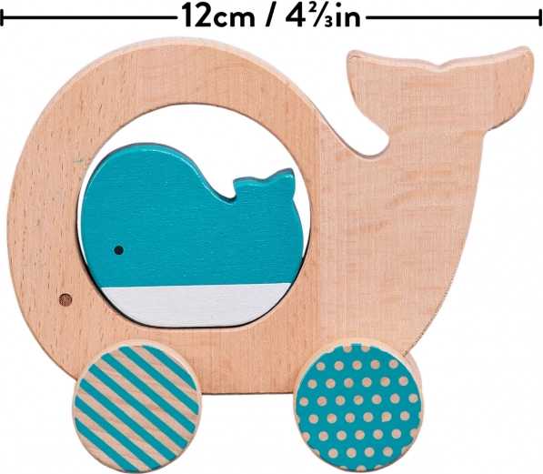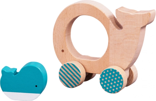 Ta stilska in varna lesena igrača otrokom prinaša veselje do gibanja in odkrivanja. Zaobljene oblike se odlično prilegajo malim rokam, na sredini kitovega telesa je odprtina s prosto nameščeno figurico mladiča, ki spodbuja interaktivno igro ter izboljšuje koordinacijo oko–roka.