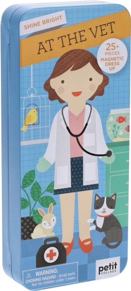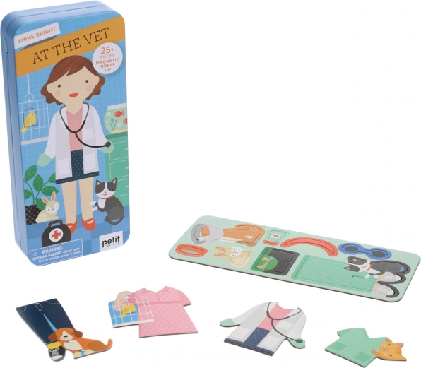 Magnetni komplet za male veterinarje ponuja vrsto magnetnih kosov oblačil in poklicne opreme, ki skupaj z scenami notranjih prostorov tvorijo praktičen komplet za na pot. Spodbuja ustvarjalnost in zabavno igro kjerkoli.