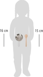 Lonec z odstranljivim pokrovom podpira realistične igralne scenarije in razvija otroško domišljijo. Lesena kuhalnica skupaj s kovinskimi orodji, kot sta lopatka in metlica, ponuja širok nabor možnosti za igro. Tekstilna prijemalka in podstavek za lonec dodajata avtentičen pridih in prispevata k varnosti pri igri.