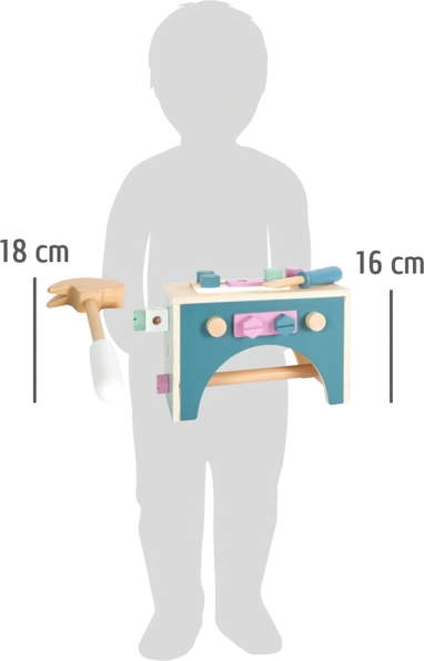 Praktična lesena škatla z orodjem 2v1 otrokom ponuja neskončne možnosti igre zaradi svoje vsestranskosti. Z obračanjem škatle jo lahko uporabijo tudi kot delovno površino, vse orodje pa je mogoče preprosto pospraviti zahvaljujoč odprtinam na straneh.