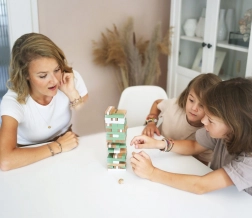 Igro obvladajo otroci že od 3. leta in jo lahko prilagodite starosti ter spretnostim igralcev – igrajte klasično ali dodajte leseno kocko za nove izzive. Embalaža 2-v-1 dodatno olajša gradnjo in varno shranjevanje koščkov.