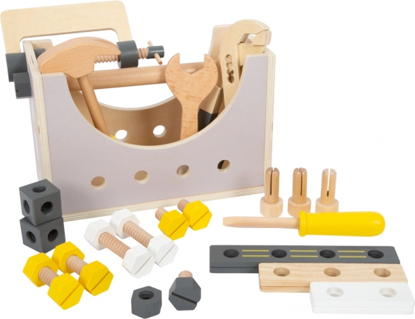 Del kompleta je 5 kosov lesenega orodja – kladivo, ključ, izvijač, nastavljivi ključ in primež – ter dovolj dodatkov za ustvarjalne projekte. Odstranljiv ročaj in praktične odprtine omogočajo hitro pospravljanje orodja, zato je škatla idealna tudi za na pot.