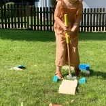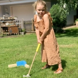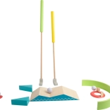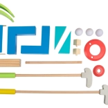 Zabaven otroški mini golf za dom in vrt iz kakovostnega FSC certificiranega lesa. Set vsebuje 3 velikosti palic, mehke varne žogice in prilagodljive ovire (val, gugalnica, tunel idr.), ki jih zlahka prilagodite starosti in spretnostim. Odlično uri spretnost in zbranost ter ponuja sodoben dizajn z vzdržljivo izdelavo.