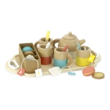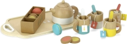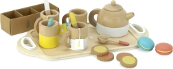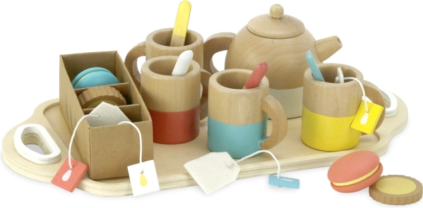 Set vsebuje: 4 skodelice, 4 žličke, 1 čajnik, 4 čajne vrečke, 2 makrona, 4 piškote v škatlici in 1 pladenj. Vse je izdelano iz kakovostnega lesa z gladkimi robovi za varno in dolgotrajno igro. Spodbuja razvoj domišljije, govora in socialnih veščin.