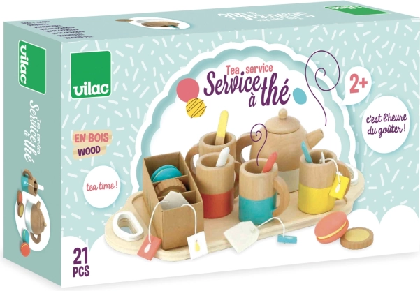 Velik leseni čajni set VILAC otrokom prinaša pristno izkušnjo čajanke. Z 21 skrbno izdelanimi deli v prijetnih pastelnih odtenkih si lahko otroci postrežejo čaj, ponudijo makarone in piškote ter se učijo vljudnosti in pravil obedovanja.
