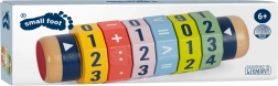 Šest vrtljivih obročkov s številkami in simboli omogoča ustvarjanje primerov za seštevanje, odštevanje, množenje in deljenje do 99 – zabavna pot do razumevanja osnov.