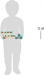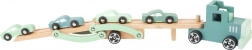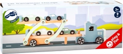 Set vsebuje tovornjak s prikolico in skupaj štiri športne avtomobilčke. Igra razvija usklajenost oko–roka, fino motoriko ter kreativno pripovedovanje zgodb. Zaradi kakovostnih materialov in gladko obdelanih robov je igrača primerna za otroke od 3 let.