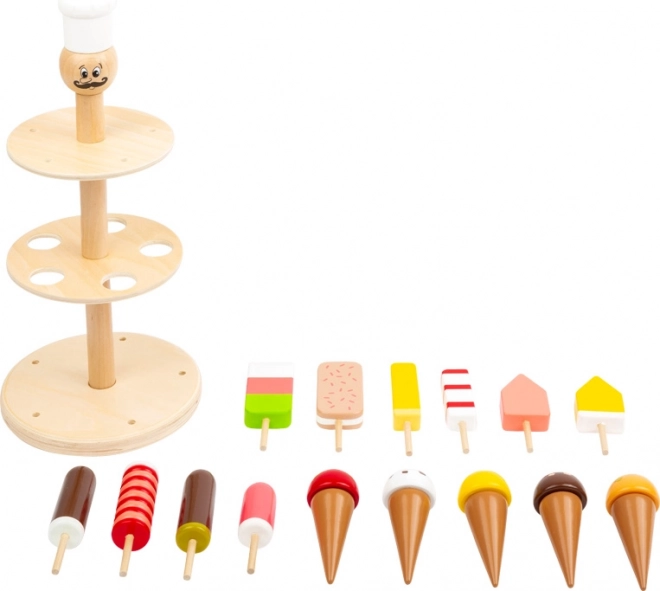 Ta skrbno zasnovana sladoledna stojnica iz masivnega lesa izpolni vsa sladoledna želje. Otroci lahko izbirajo med lučkami in krogličnim sladoledom v vafelnem kornetu ter si sestavijo lastno vitrino polno pisanih dobrot. Zaradi stabilne konstrukcije je idealna za otroško trgovino, kuhinjo ali kavarnico.