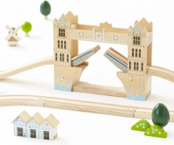 Ta velika lesena železniška proga popelje otroke v srce mesta, navdihnjenega z Londonom. Z bogato opremo – od postaje in pisanih stavb do ikoničnega dvižnega mostu – ponuja nešteto igralnih scenarijev ter spodbuja odprto, domišljijsko igro. Dva vlaka z magnetnimi vagoni se zlahka spajata in varno vozita po stabilnih lesenih tirih.