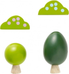 Obsežen set z razvejano mrežo tirov, dvema vlakoma z magnetnimi vagoni, drevesi in prometnimi elementi spodbuja domišljijo ter razvoj fine motorike.
