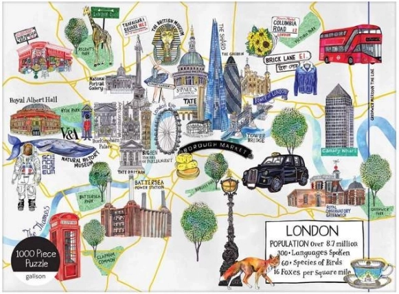 Odkrijte čar metropole z ilustriranim zemljevidom Londona na sestavljanki s 1000 koščki. Uživajte v vrhunski kakovosti, natančno prilegajočih se koščkih in netoksičnih črnilih na recikliranem papirju – idealno za zabavo in učenje za otroke od 8 let naprej.