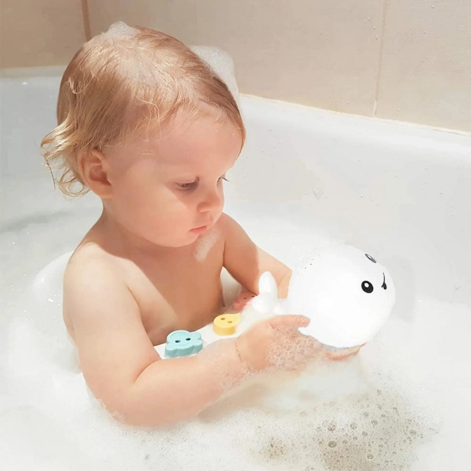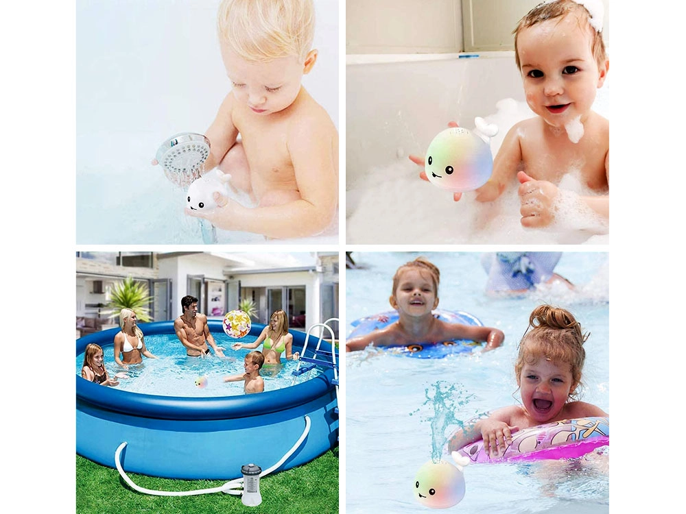 Po potopitvi v vodo se kit sam vklopi in ustvarja nežno vodno fontanico, ki otroke zabava dolge minute.