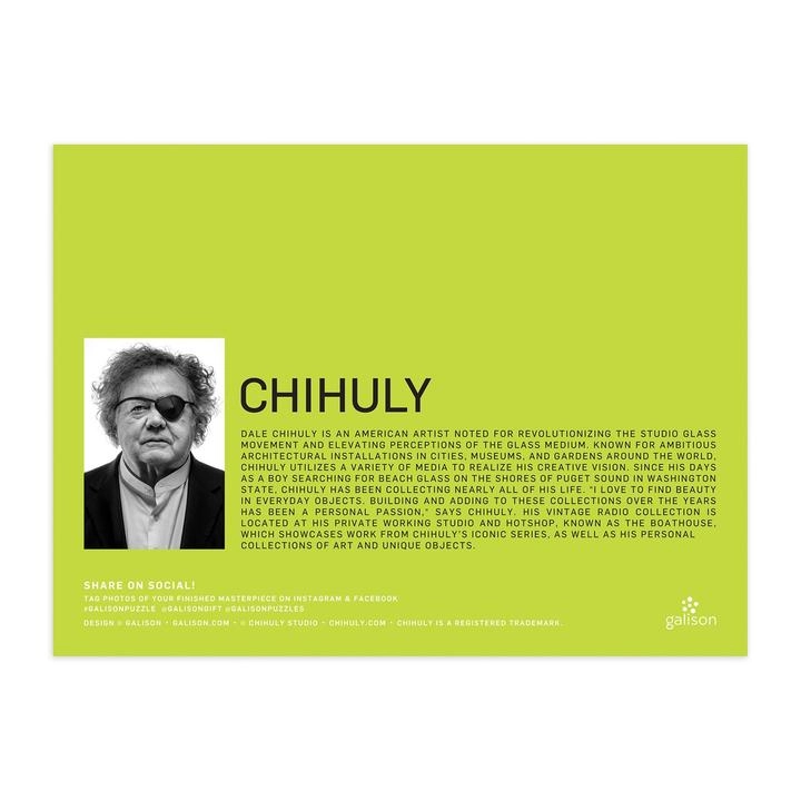 Odkrijte edinstvene sestavljanke z motivom zbirke starih radiev umetnika Dale CHIHULY. Komplet s 1000 kosi v vrhunski kakovosti je natisnjen z netoksičnimi črnili, kosi natančno pristajajo in odlično razvijajo logično razmišljanje ter fino motoriko.