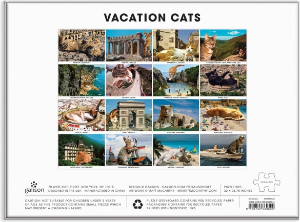 Šaljiva sestavljanka z mačkami na počitnicah s 1500 kosi ponuja zabavo in sprostitev. Vsebuje šestnajst realističnih fotografij, na katerih uživate v mačkah, ki občudujejo znane kraje sveta.