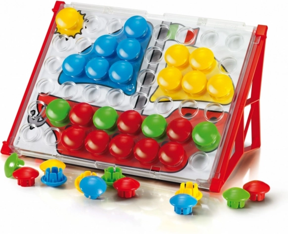 Odkrijte ustvarjalni mozaik QUERCETTI za najmlajše! Komplet vsebuje 48 velikih, nelomljivih gumbov s premerom 32 mm, prozorno ploščo z luknjami ter 8 dvostranskih kart z 16 predlogami. Praktično stojalo za poševno postavitev olajša igro doma in na poti. Igra razvija vizuomotorično koordinacijo, fino motoriko in ustvarjalnost otrok od 2. leta dalje.