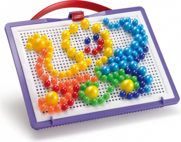 Priljubljena otroška mozaika Quercetti prinaša ure smiselne zabave. Barvni žebljički različnih premerov se zlahka vstavljajo v odporno perforirano ploščo, kar podpira koordinacijo oko–roka, uri potrpežljivost in krepi vizualno zaznavanje barv in oblik. Zahvaljujoč pametnemu kovčku je vse varno pospravljeno in pripravljeno za na pot.