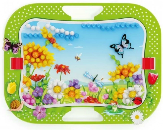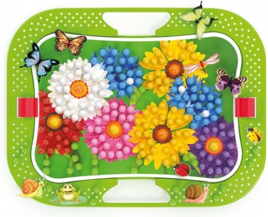 Ustvarite si iz žebljičkov svojo cvetočo vrtno kuliso! Klasični žebljički Quercetti v barvni različici, ki predstavlja svet narave. Set vsebuje žebljičke različnih barv in premerov, z vstavljanjem katerih oblikujete različne krajinske prizore, ter veliko nalepk in figuric metuljev, kačjih pastirjev, pikapolonic in drugih bitij, s katerimi lahko naselite svoj naravni svet. Vsebina pakiranja: 1 preluknjana podloga 28 × 20 cm, 2 vzorčni sliki, 300 žebljičkov v 6 različnih barvah, 16 figuric, 1 podstavek z stojalom, 1 leseno prebodno pero. Glavne lastnosti: razvija fino motoriko, ustvarjalnost in domišljijo, vsebuje 316 gumbkov, za otroke od 3 let dalje.