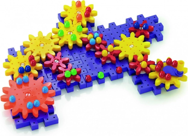 Set barvnih zobnikov in figur omogoča otrokom ustvarjanje različnih struktur, pri čemer se na zabaven način učijo osnov mehanike.