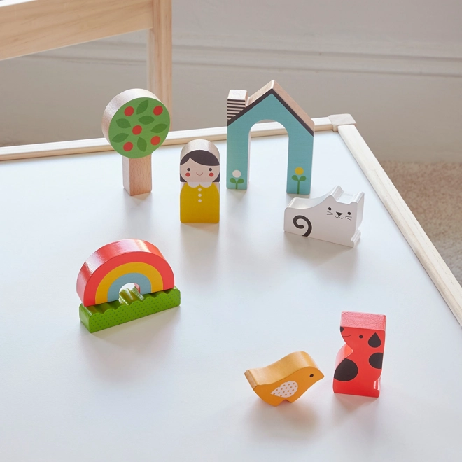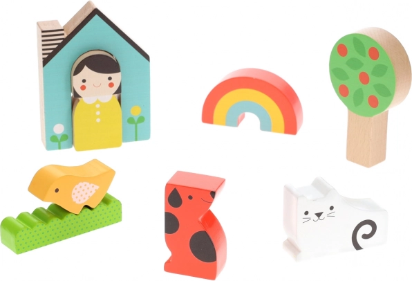Ta barvit set omogoča otrokom ustvarjati domače prizore ali sestavljati kot puzzle. Kosi so zasnovani tako, da se lepo prilegajo otroškim rokam in so izdelani iz 100% FSC® lesa, kar zagotavlja prijaznost do narave.